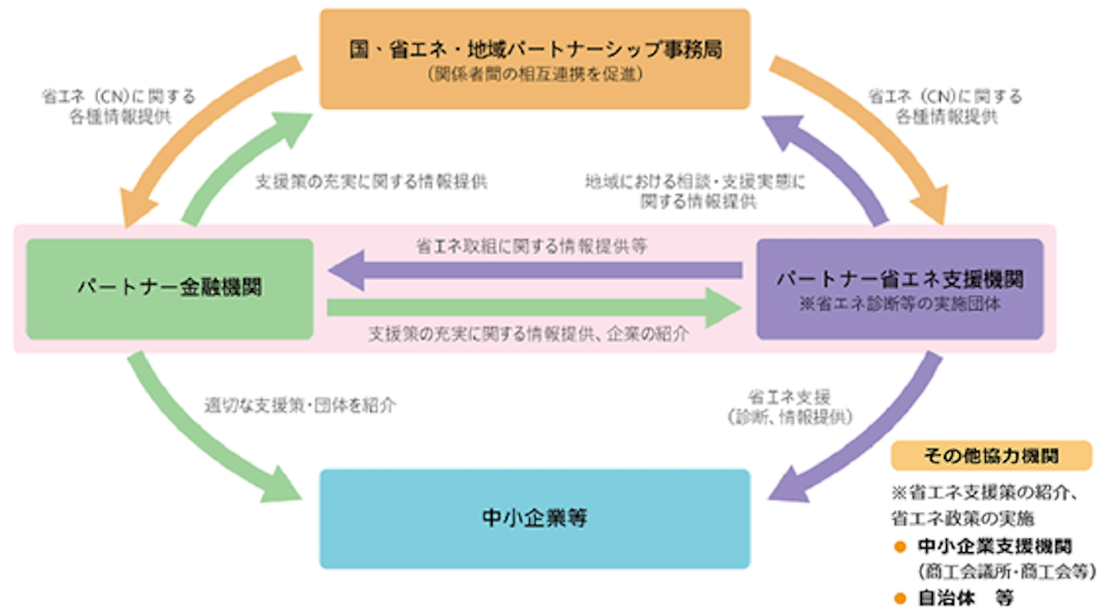- 各地域の中小企業等の省エネを支援する体制を構築するため、資源エネルギー庁が立ち上げた枠組みで、200を超える金融機関や省エネ支援機関※が、パートナー機関として参加しています。